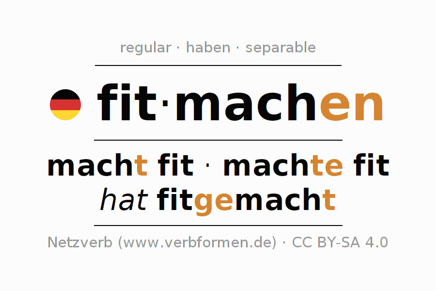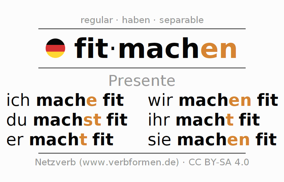 El verbo fitmachen, conjugado completamente en todas las personas y números gramaticales en Presente Indicativo.