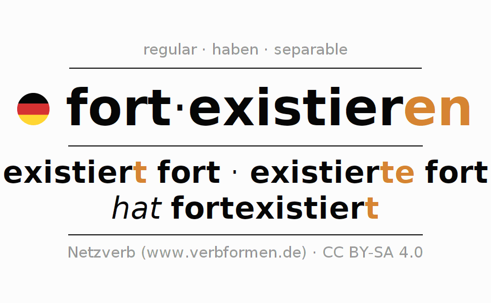 Este verbo fortexistieren (existir, permanecer) se conjuga en presente de la siguiente manera: ich existiere fort, du existierst fort, er existiert fort, wir existieren fort, ihr existiert fort, sie existieren fort