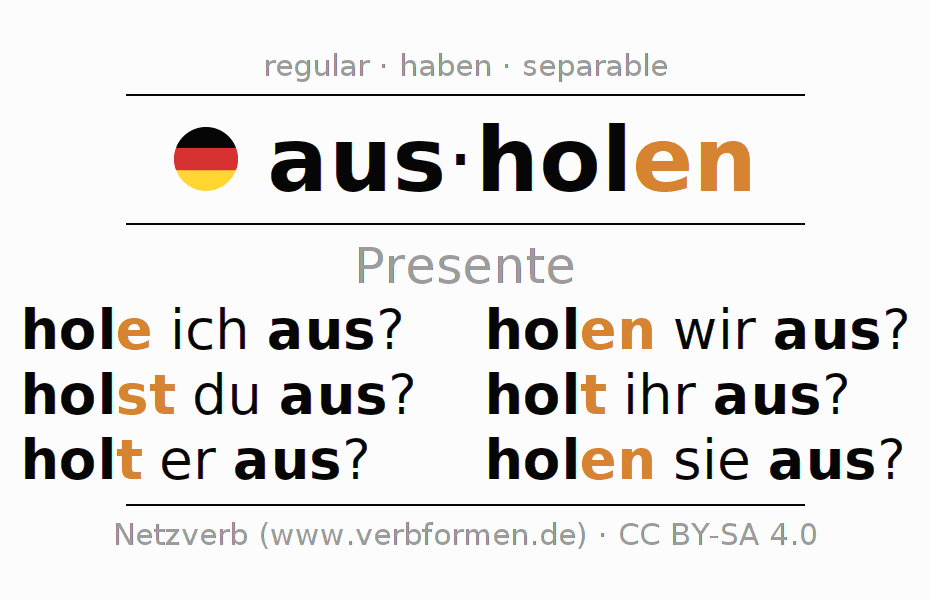 La conjugación de ausholen en Presente Indicativo Presente Activo es hole ich aus?, holst du aus?, holt er aus?, holen wir aus?, holt ihr aus?, holen sie aus?.Para construir esta formas se requiere seguir algunas reglas gramaticales y también las especificaciones para la conjugación de verbos simples de ausholen en Presente . Comentarios ☆