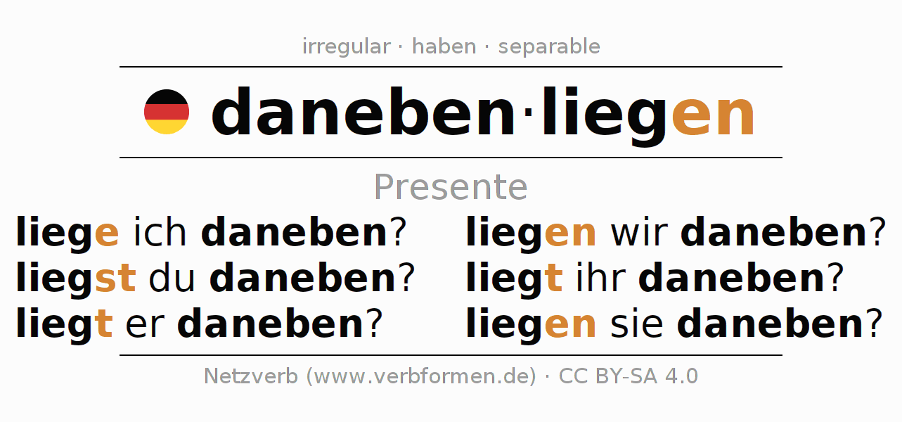 La conjugación de danebenliegen en Presente Indicativo Presente Activo es liege ich daneben?, liegst du daneben?, liegt er daneben?, liegen wir daneben?, liegt ihr daneben?, liegen sie daneben?.Para construir esta formas se requiere seguir algunas reglas gramaticales y también las especificaciones para la conjugación de verbos simples de danebenliegen en Presente . Comentarios ☆