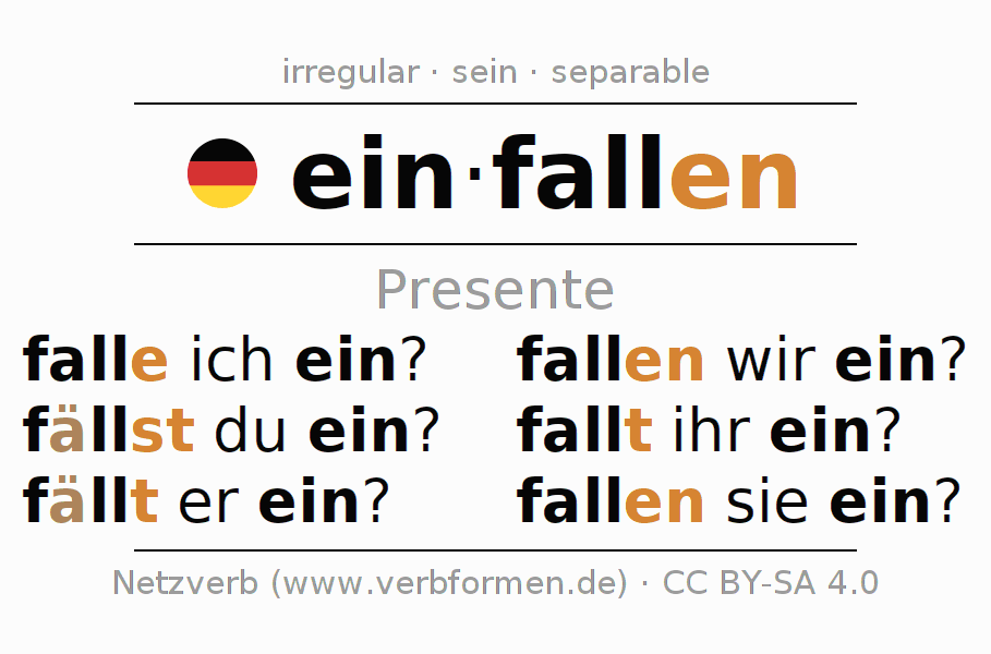 La conjugación de einfallen en Presente Indicativo Presente Activo es falle ich ein?, fällst du ein?, fällt er ein?, fallen wir ein?, fallt ihr ein?, fallen sie ein?.Para construir esta formas se requiere seguir algunas reglas gramaticales y también las especificaciones para la conjugación de verbos simples de einfallen en Presente . Comentarios ☆