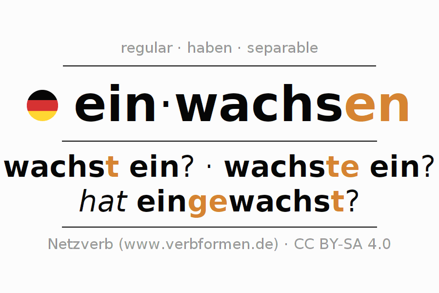 El verbo einwachsen (regelm) (hat), conjugado completamente en todas las personas y números gramaticales en Presente Indicativo.
