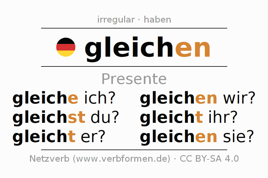 La conjugación de gleichen en Presente Indicativo Presente Activo es gleiche ich?, gleichst du?, gleicht er?, gleichen wir?, gleicht ihr?, gleichen sie?.Para construir esta formas se requiere seguir algunas reglas gramaticales y también las especificaciones para la conjugación de verbos simples de gleichen en Presente . Comentarios ☆