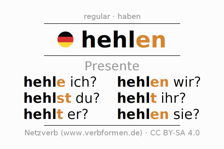 La conjugación de hehlen en Presente Indicativo Presente Activo es hehle ich?, hehlst du?, hehlt er?, hehlen wir?, hehlt ihr?, hehlen sie?.Para construir esta formas se requiere seguir algunas reglas gramaticales y también las especificaciones para la conjugación de verbos simples de hehlen en Presente . Comentarios ☆