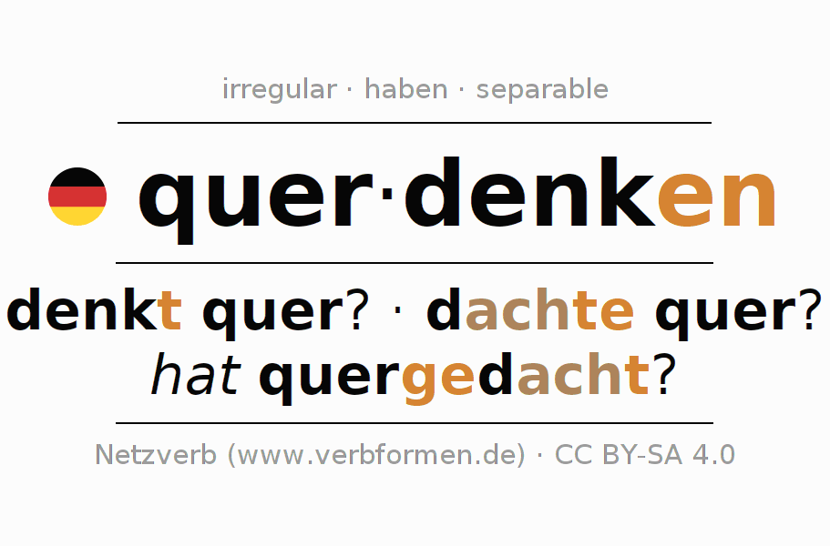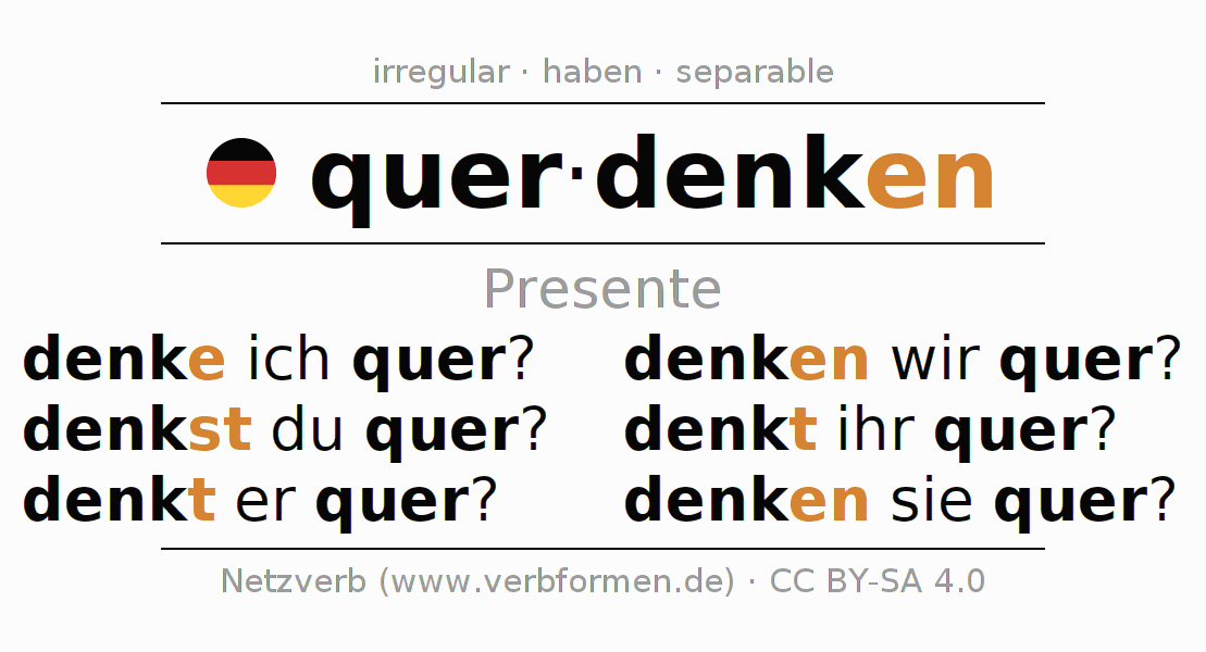 La conjugación de querdenken en Presente Indicativo Presente Activo es denke ich quer?, denkst du quer?, denkt er quer?, denken wir quer?, denkt ihr quer?, denken sie quer?.Para construir esta formas se requiere seguir algunas reglas gramaticales y también las especificaciones para la conjugación de verbos simples de querdenken en Presente . Comentarios ☆