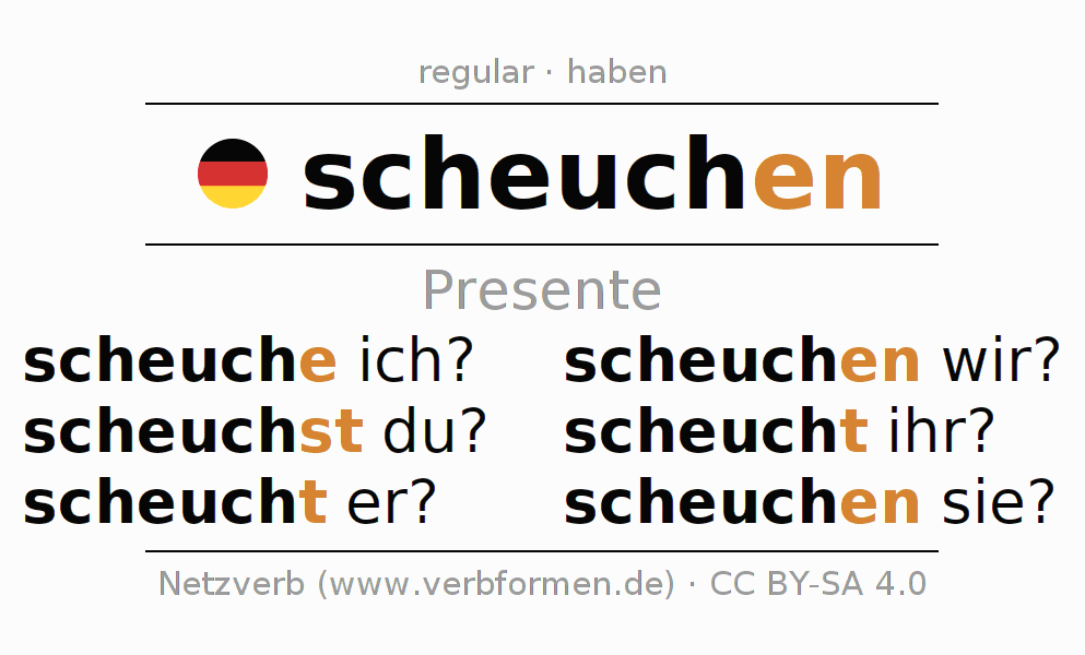 La conjugación de scheuchen en Presente Indicativo Presente Activo es scheuche ich?, scheuchst du?, scheucht er?, scheuchen wir?, scheucht ihr?, scheuchen sie?.Para construir esta formas se requiere seguir algunas reglas gramaticales y también las especificaciones para la conjugación de verbos simples de scheuchen en Presente . Comentarios ☆
