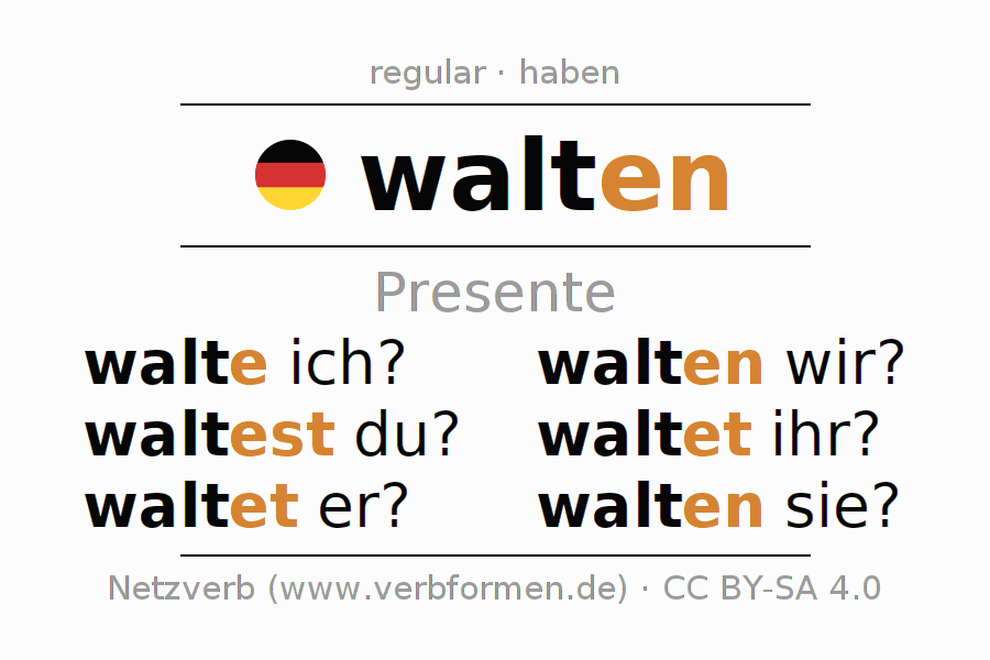 La conjugación de walten en Presente Indicativo Presente Activo es walte ich?, waltest du?, waltet er?, walten wir?, waltet ihr?, walten sie?.Para construir esta formas se requiere seguir algunas reglas gramaticales y también las especificaciones para la conjugación de verbos simples de walten en Presente . Comentarios ☆