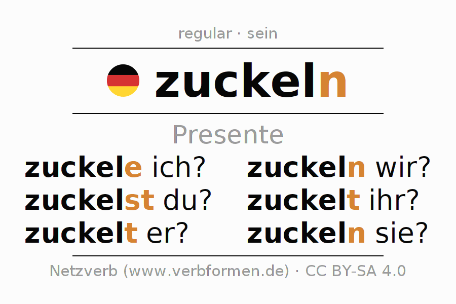El verbo zuckeln, conjugado completamente en todas las personas y números gramaticales en Presente Indicativo.