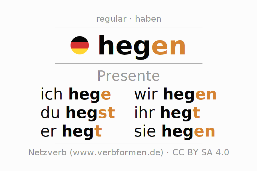 Este verbo hegen (cuidar, mantener) se conjuga en presente de la siguiente manera: ich hege, du hegst, er hegt, wir hegen, ihr hegt, sie hegen