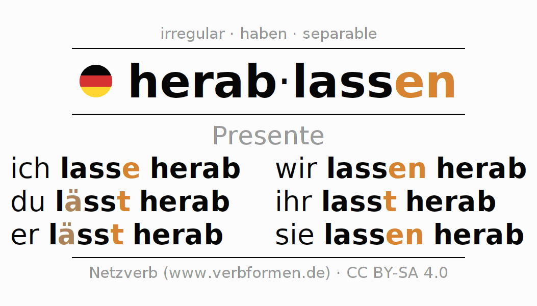 Este verbo herablassen (bajar, ayudar) se conjuga en presente de la siguiente manera: ich lasse herab, du lässt herab, er lässt herab, wir lassen herab, ihr lasst herab, sie lassen herab