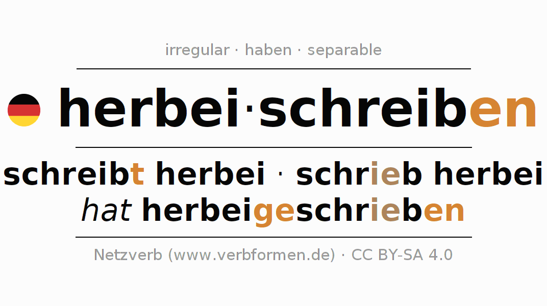 El verbo herbeischreiben, conjugado completamente en todas las personas y números gramaticales en Presente Indicativo.