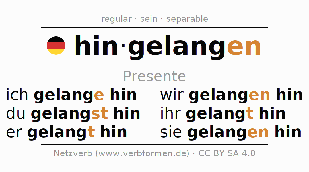 Este verbo hingelangen (alcanzar, aportar) se conjuga en presente de la siguiente manera: ich gelange hin, du gelangst hin, er gelangt hin, wir gelangen hin, ihr gelangt hin, sie gelangen hin