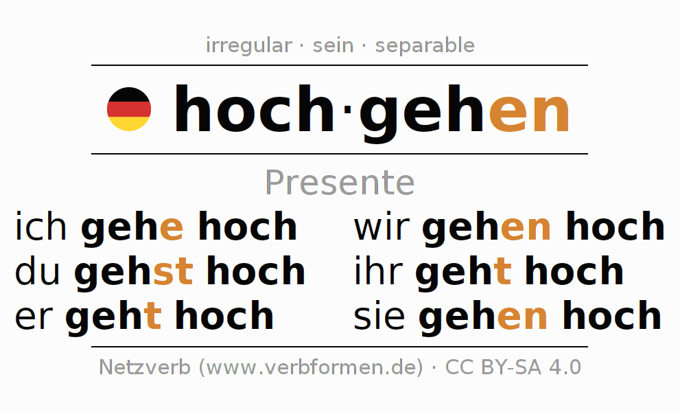 Este verbo hochgehen (subir, ascender) se conjuga en presente de la siguiente manera: ich gehe hoch, du gehst hoch, er geht hoch, wir gehen hoch, ihr geht hoch, sie gehen hoch