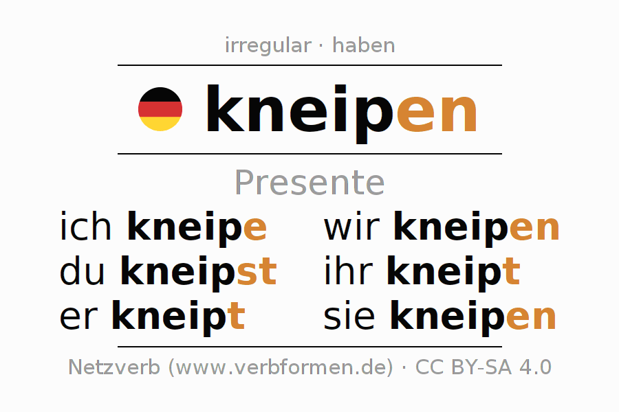 Este verbo kneipen (ir de bares, ir de copas) se conjuga en presente de la siguiente manera: ich kneipe, du kneipst, er kneipt, wir kneipen, ihr kneipt, sie kneipen
