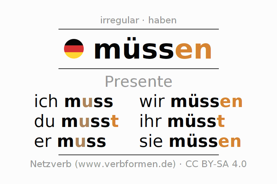 Este verbo müssen (deber, tener que) se conjuga en presente de la siguiente manera: ich muss, du musst, er muss, wir müssen, ihr müsst, sie müssen