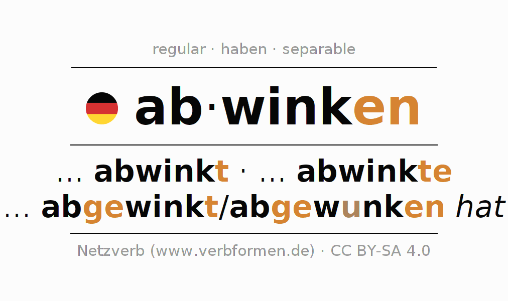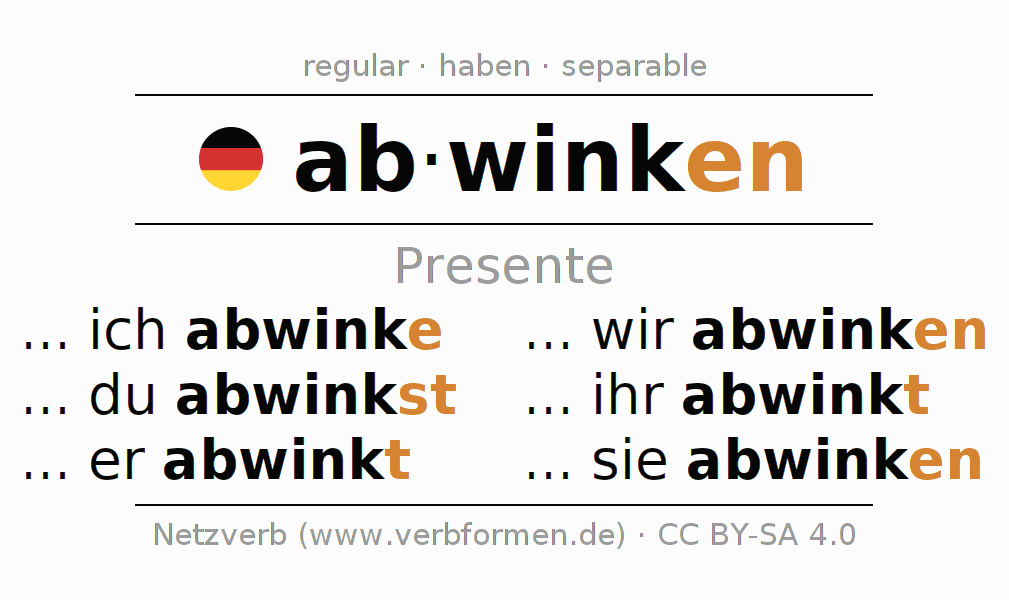 El verbo abwinken, conjugado completamente en todas las personas y números gramaticales en Presente Indicativo.