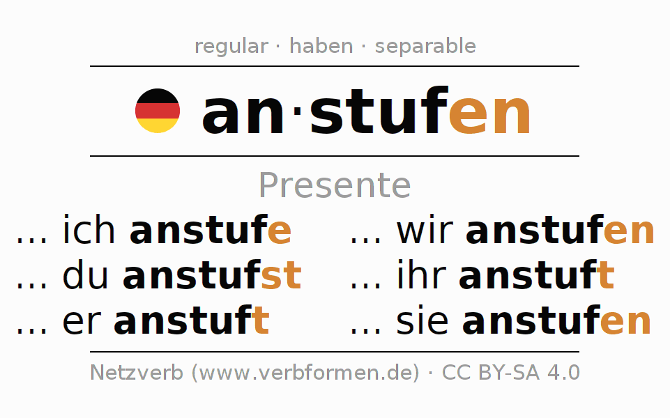 El verbo anstufen, conjugado completamente en todas las personas y números gramaticales en Presente Indicativo.