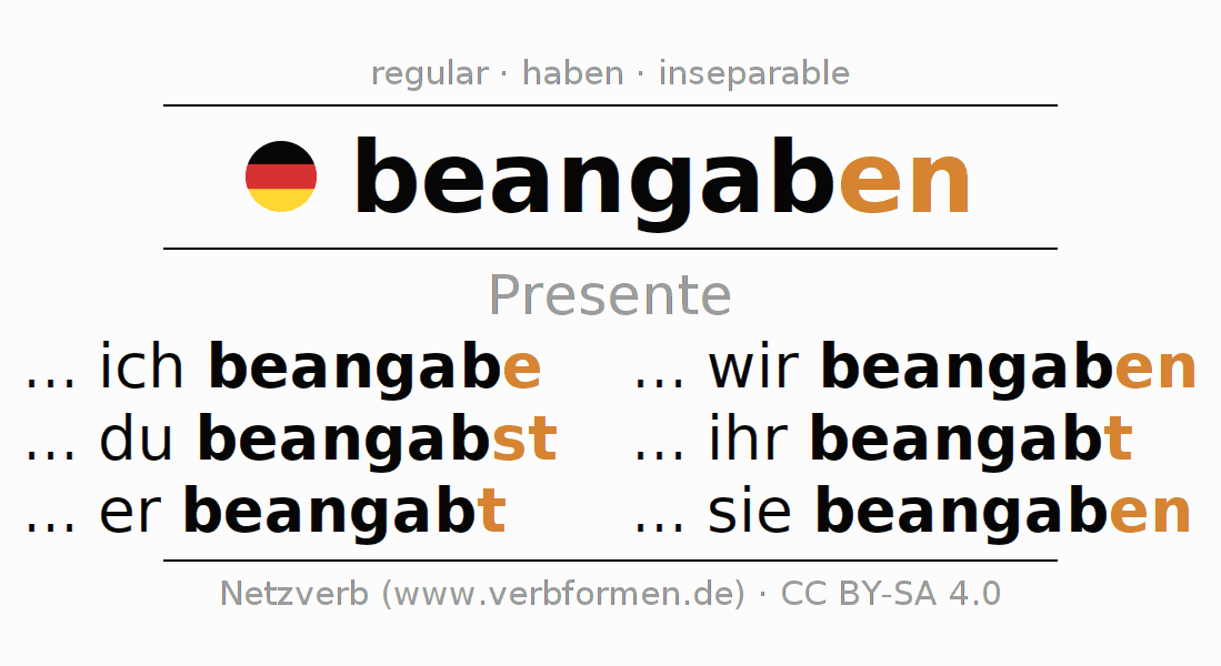 El verbo beangaben, conjugado completamente en todas las personas y números gramaticales en Presente Indicativo.
