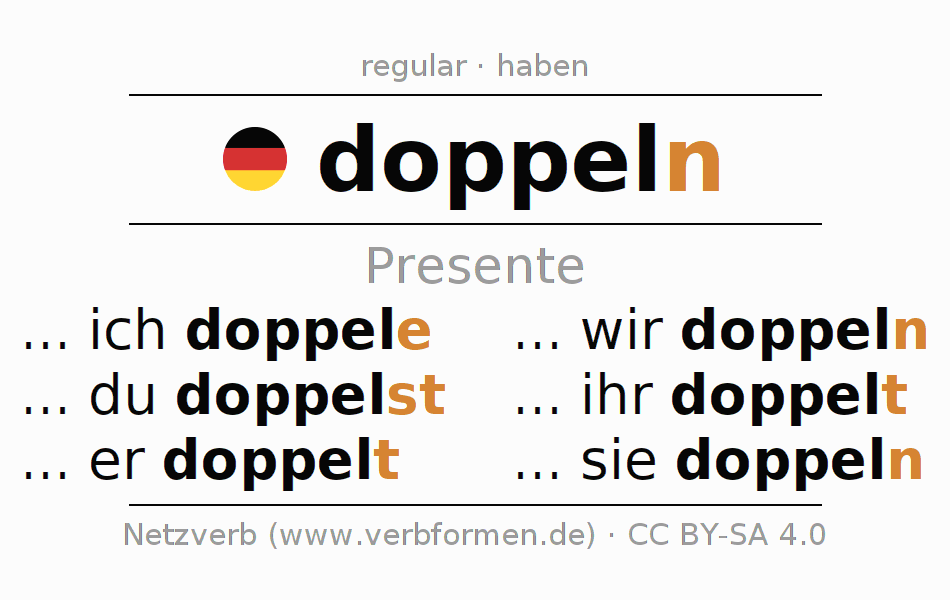 El verbo doppeln, conjugado completamente en todas las personas y números gramaticales en Presente Indicativo.