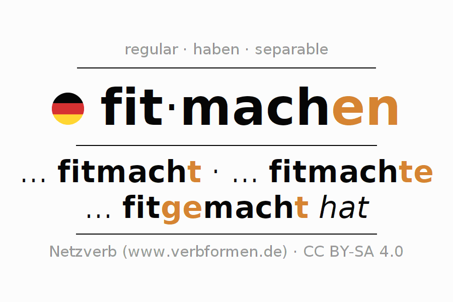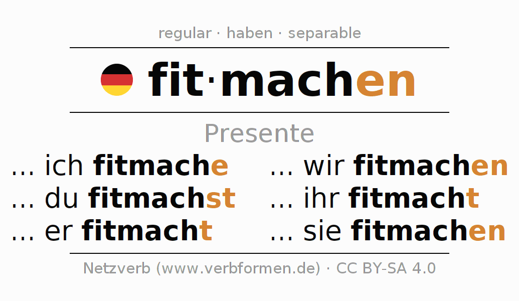 El verbo fitmachen, conjugado completamente en todas las personas y números gramaticales en Presente Indicativo.