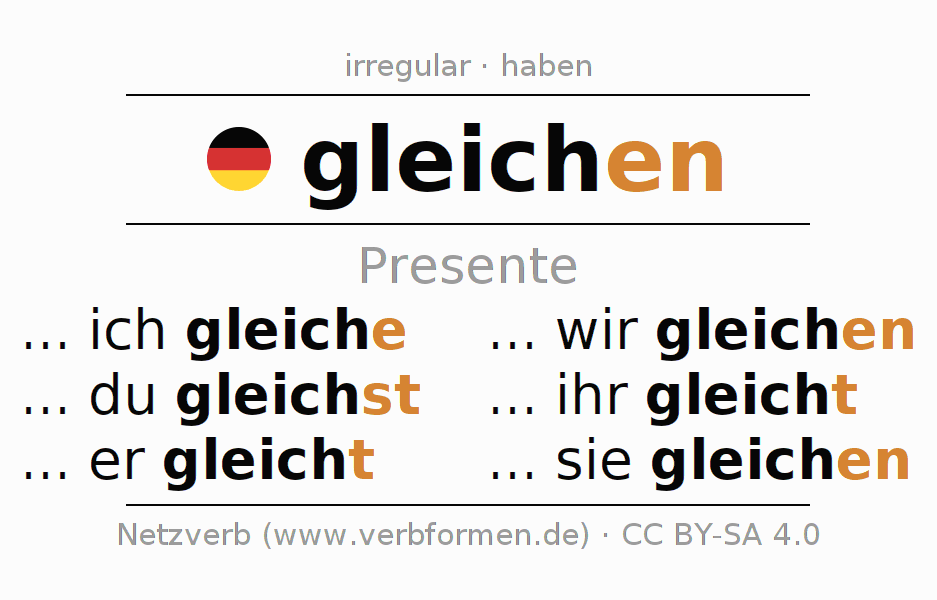 El verbo gleichen, conjugado completamente en todas las personas y números gramaticales en Presente Indicativo.