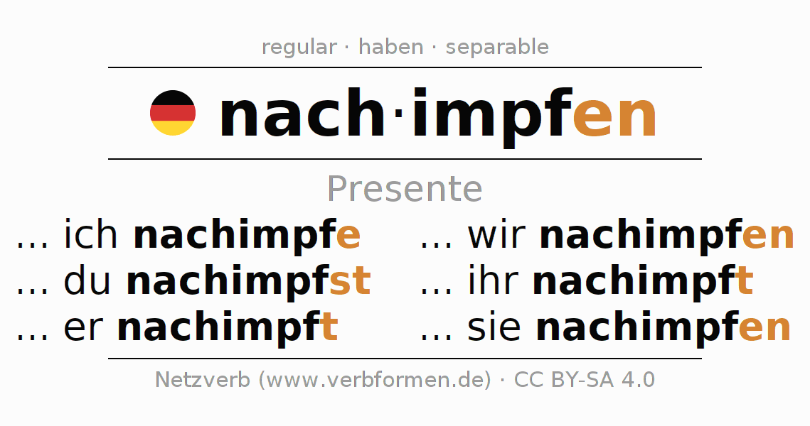 La conjugación de nachimpfen en Presente Indicativo Presente Activo es ... ich nachimpfe, ... du nachimpfst, ... er nachimpft, ... wir nachimpfen, ... ihr nachimpft, ... sie nachimpfen.Para construir esta formas se requiere seguir algunas reglas gramaticales y también las especificaciones para la conjugación de verbos simples de nachimpfen en Presente . Comentarios ☆