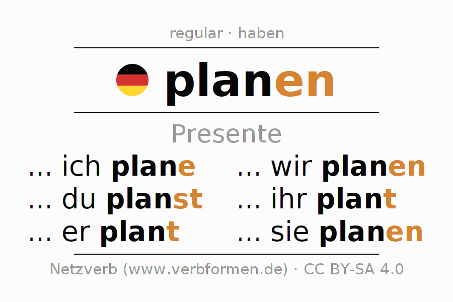 La conjugación de planen en Presente Indicativo Presente Activo es ... ich plane, ... du planst, ... er plant, ... wir planen, ... ihr plant, ... sie planen.Para construir esta formas se requiere seguir algunas reglas gramaticales y también las especificaciones para la conjugación de verbos simples de planen en Presente . Comentarios ☆
