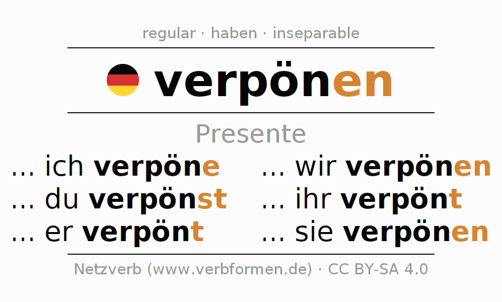 El verbo verpönen, conjugado completamente en todas las personas y números gramaticales en Presente Indicativo.
