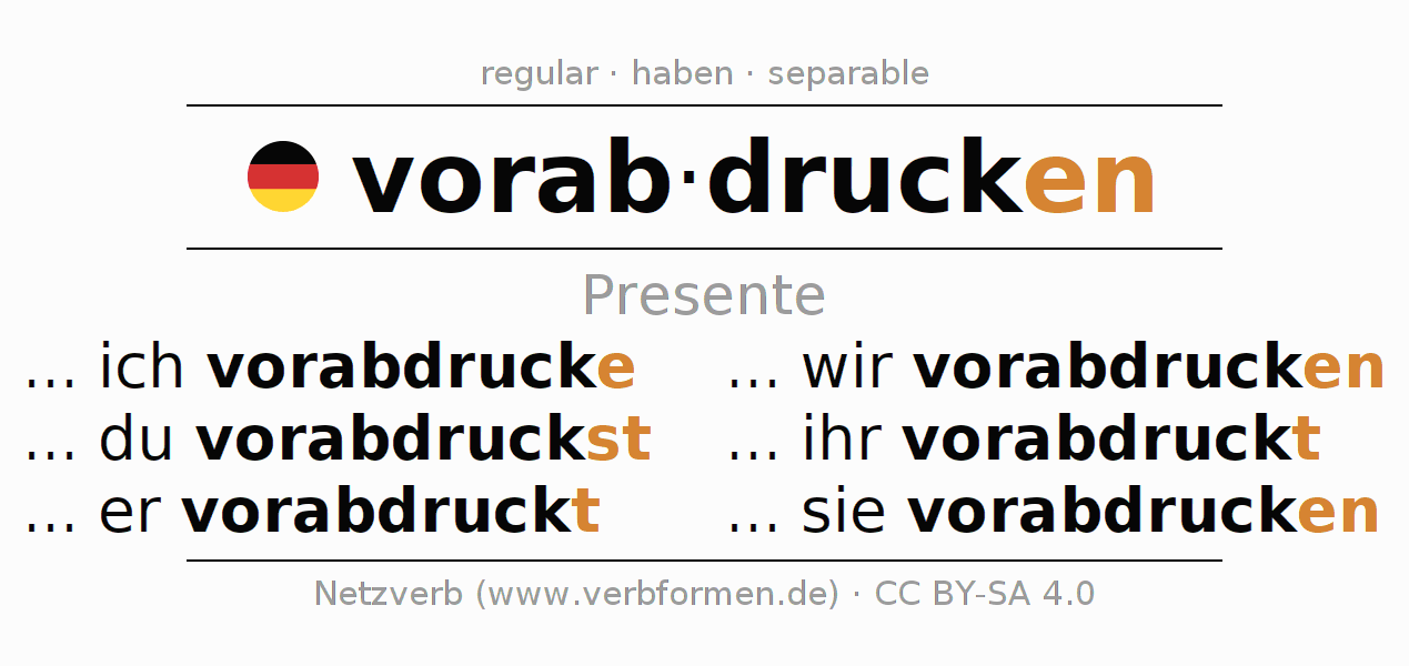 El verbo vorabdrucken, conjugado completamente en todas las personas y números gramaticales en Presente Indicativo.