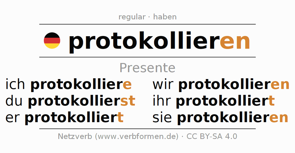 El verbo protokollieren, conjugado completamente en todas las personas y números gramaticales en Presente Indicativo.