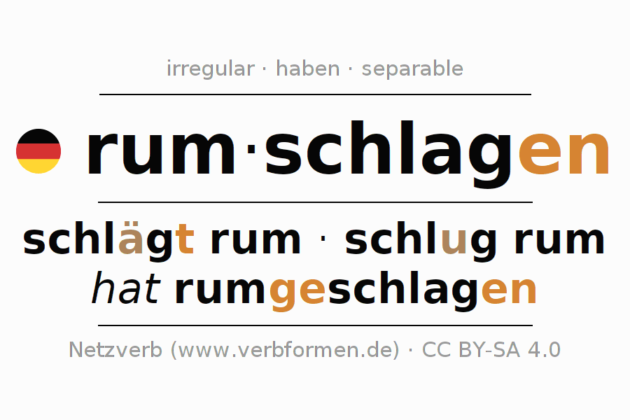 El verbo rumschlagen, conjugado completamente en todas las personas y números gramaticales en Presente Indicativo.