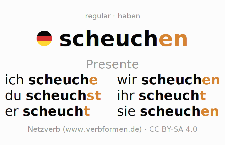 Este verbo scheuchen (espantar, ahuyentar) se conjuga en presente de la siguiente manera: ich scheuche, du scheuchst, er scheucht, wir scheuchen, ihr scheucht, sie scheuchen