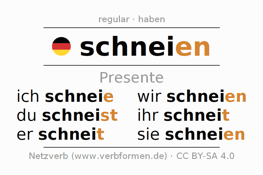 Este verbo schneien (nevar) se conjuga en presente de la siguiente manera: ich schneie, du schneist, er schneit, wir schneien, ihr schneit, sie schneien