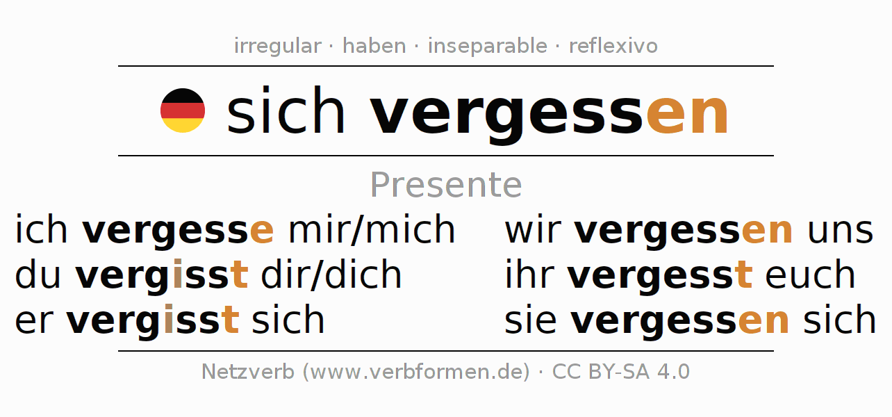El verbo sich vergessen, conjugado completamente en todas las personas y números gramaticales en Presente Indicativo.