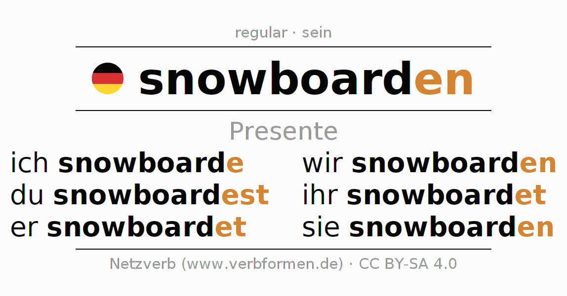 El verbo snowboarden (ist), conjugado completamente en todas las personas y números gramaticales en Presente Indicativo.