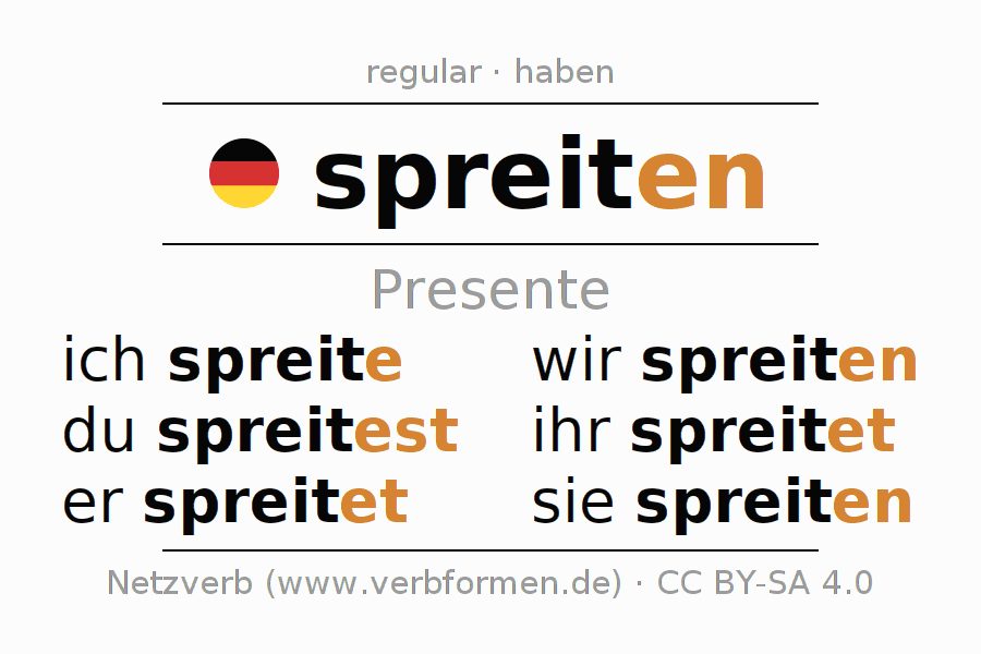 Este verbo spreiten (desplegar, extender) se conjuga en presente de la siguiente manera: ich spreite, du spreitest, er spreitet, wir spreiten, ihr spreitet, sie spreiten