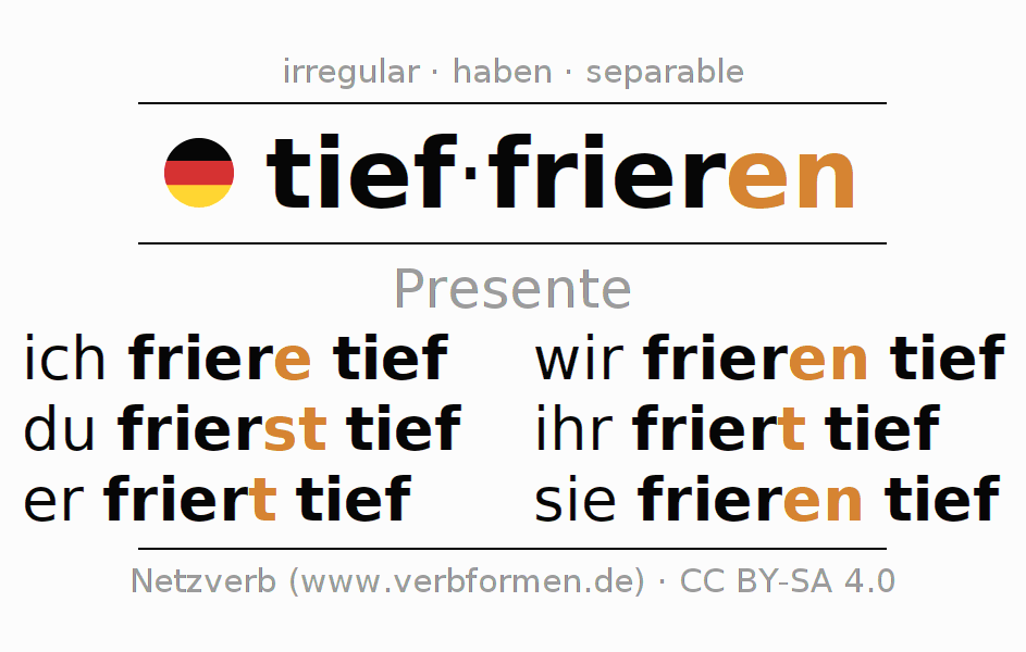 El verbo tieffrieren, conjugado completamente en todas las personas y números gramaticales en Presente Indicativo.