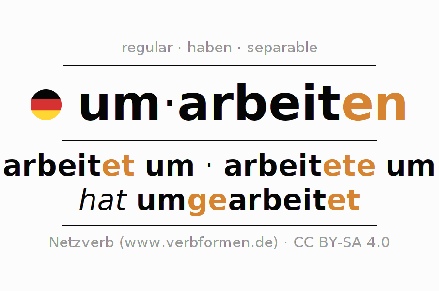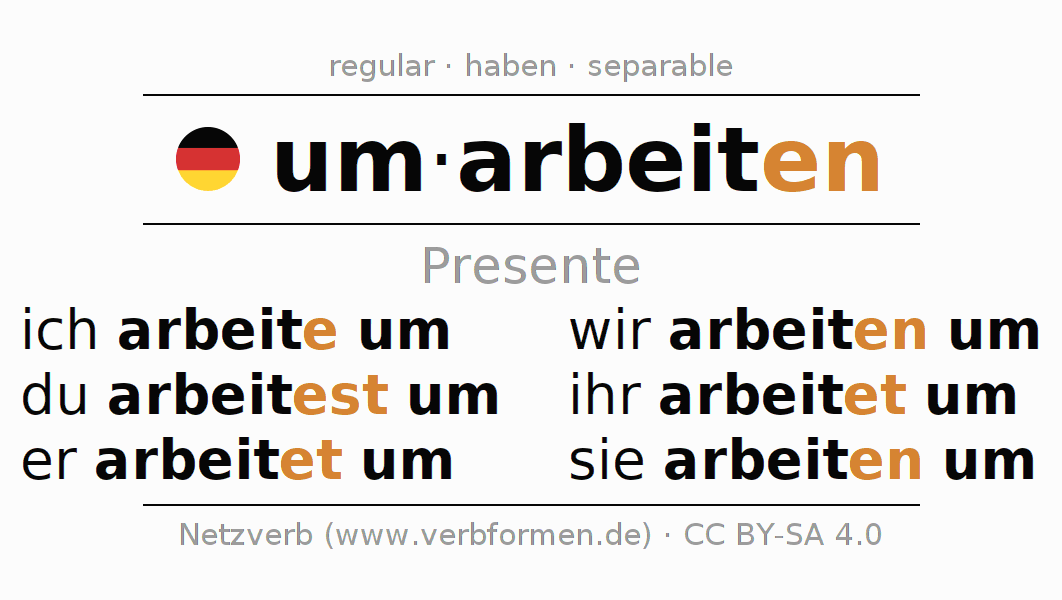 Este verbo umarbeiten (modificar, transformar) se conjuga en presente de la siguiente manera: ich arbeite um, du arbeitest um, er arbeitet um, wir arbeiten um, ihr arbeitet um, sie arbeiten um