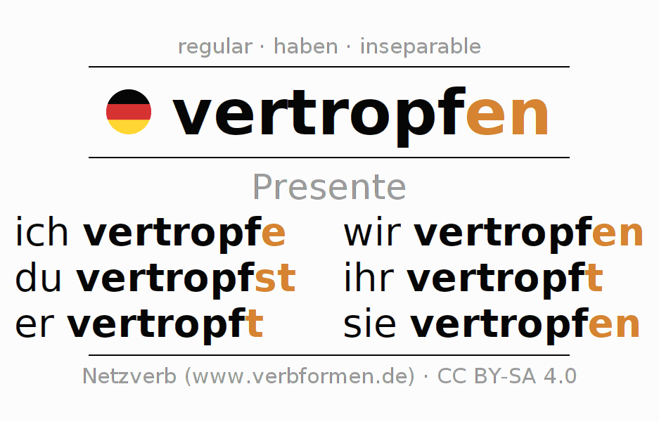El verbo vertropfen, conjugado completamente en todas las personas y números gramaticales en Presente Indicativo.