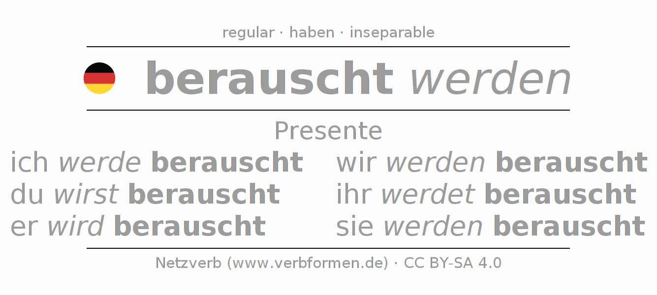 La conjugación de berauschen en Presente Indicativo Presente Pasivo procesivo es ich werde berauscht, du wirst berauscht, er wird berauscht, wir werden berauscht, ihr werdet berauscht, sie werden berauscht.Para construir esta formas se requiere seguir algunas reglas gramaticales y también las especificaciones para la conjugación de verbos simples de berauschen en Presente . Comentarios ☆