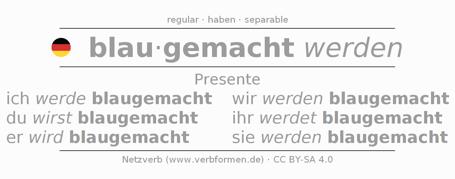 El verbo blaumachen, conjugado completamente en todas las personas y números gramaticales en Presente Indicativo.