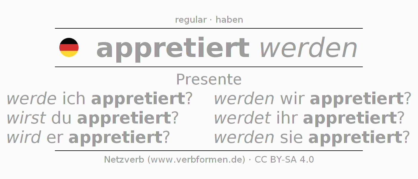 La conjugación de appretieren en Presente Indicativo Presente Pasivo procesivo es werde ich appretiert?, wirst du appretiert?, wird er appretiert?, werden wir appretiert?, werdet ihr appretiert?, werden sie appretiert?.Para construir esta formas se requiere seguir algunas reglas gramaticales y también las especificaciones para la conjugación de verbos simples de appretieren en Presente . Comentarios ☆