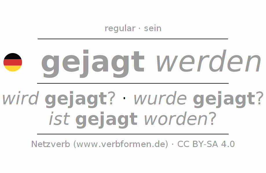 La conjugación de jagen en Presente Indicativo Presente Pasivo procesivo es werde ich gejagt?, wirst du gejagt?, wird er gejagt?, werden wir gejagt?, werdet ihr gejagt?, werden sie gejagt?.Para construir esta formas se requiere seguir algunas reglas gramaticales y también las especificaciones para la conjugación de verbos simples de jagen en Presente . Comentarios ☆