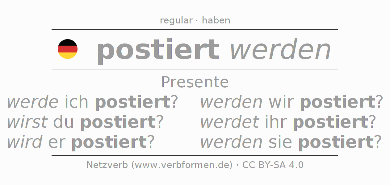 La conjugación de postieren en Presente Indicativo Presente Pasivo procesivo es werde ich postiert?, wirst du postiert?, wird er postiert?, werden wir postiert?, werdet ihr postiert?, werden sie postiert?.Para construir esta formas se requiere seguir algunas reglas gramaticales y también las especificaciones para la conjugación de verbos simples de postieren en Presente . Comentarios ☆