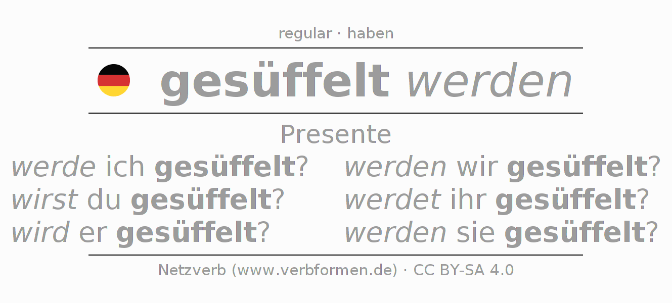 La conjugación de süffeln en Presente Indicativo Presente Pasivo procesivo es werde ich gesüffelt?, wirst du gesüffelt?, wird er gesüffelt?, werden wir gesüffelt?, werdet ihr gesüffelt?, werden sie gesüffelt?.Para construir esta formas se requiere seguir algunas reglas gramaticales y también las especificaciones para la conjugación de verbos simples de süffeln en Presente . Comentarios ☆