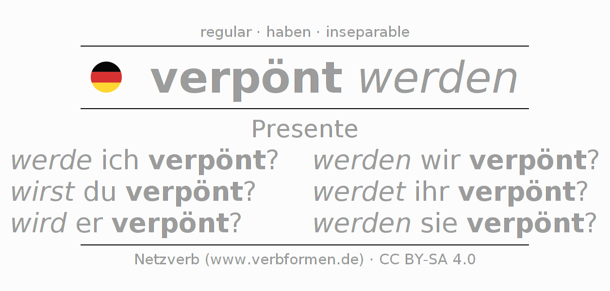 El verbo verpönen, conjugado completamente en todas las personas y números gramaticales en Presente Indicativo.