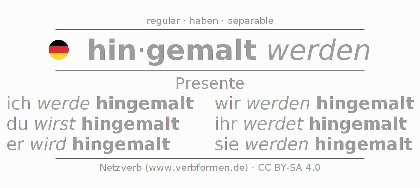La conjugación de hinmalen en Presente Indicativo Presente Pasivo procesivo es ich werde hingemalt, du wirst hingemalt, er wird hingemalt, wir werden hingemalt, ihr werdet hingemalt, sie werden hingemalt.Para construir esta formas se requiere seguir algunas reglas gramaticales y también las especificaciones para la conjugación de verbos simples de hinmalen en Presente . Comentarios ☆