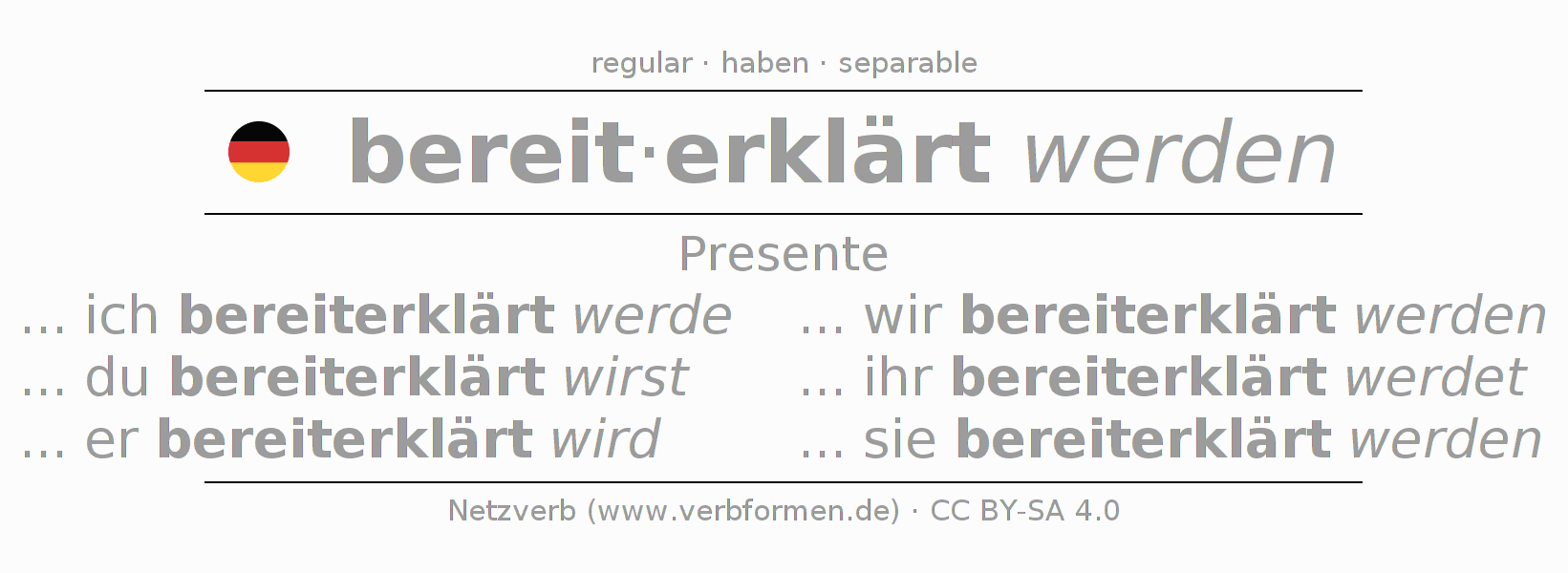 El verbo bereiterklären, conjugado completamente en todas las personas y números gramaticales en Presente Indicativo.
