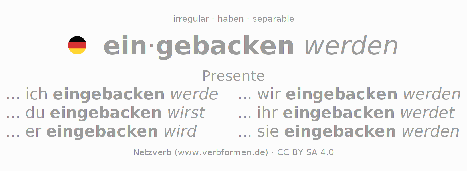 El verbo einbacken (unr), conjugado completamente en todas las personas y números gramaticales en Presente Indicativo.