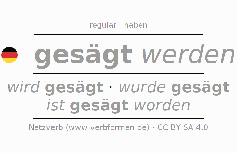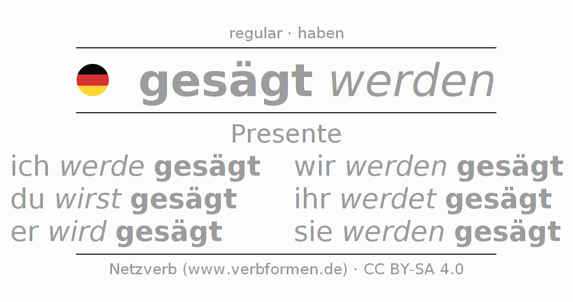 La conjugación de sägen en Presente Indicativo Presente Pasivo procesivo es ich werde gesägt, du wirst gesägt, er wird gesägt, wir werden gesägt, ihr werdet gesägt, sie werden gesägt.Para construir esta formas se requiere seguir algunas reglas gramaticales y también las especificaciones para la conjugación de verbos simples de sägen en Presente . Comentarios ☆